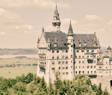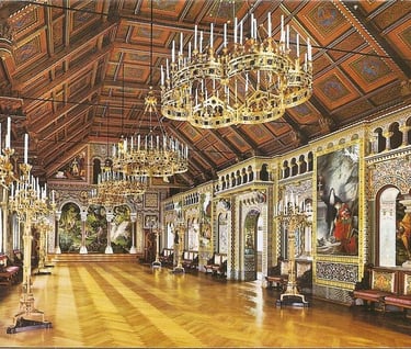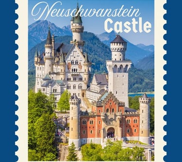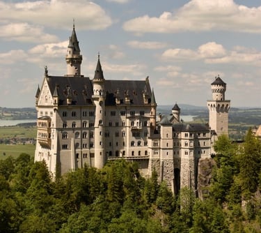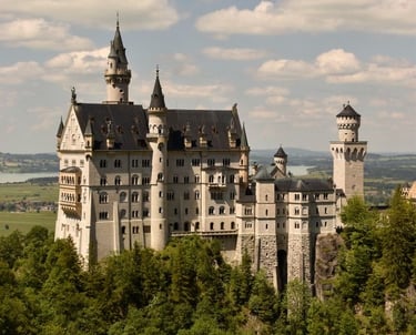 Neuschwanstein, berlokasi di Füssen, Bayern Selatan. Kastil bergaya romantis abad pertengahan, terinspirasi opera Wagner dan dongeng. Menjadi inspirasi kastil Disney.