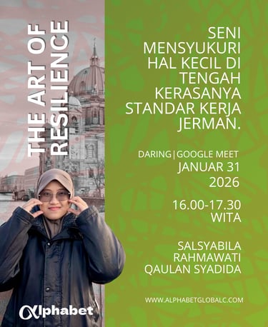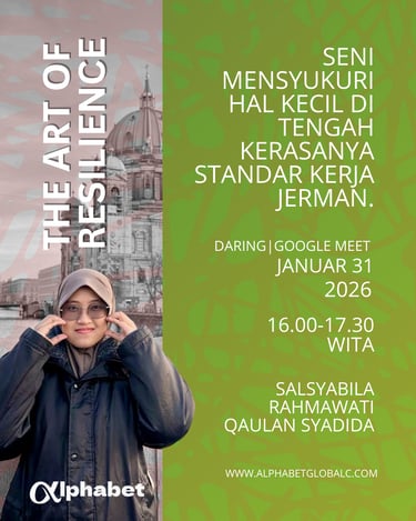 Banjarmasin, 31 Januari 2026 — Dalam sebuah webinar yang menyentuh hati bertajuk “The Art of Resilience”, Salsyabila Rahmawati Qaulani Syadida membuka ruang refleksi bagi para peserta untuk memahami makna ketangguhan, syukur, dan adaptasi dalam menghadapi tantangan hidup di Jerman. Acara yang berlangsung secara daring melalui Google Meet ini diinisiasi oleh Alphabet Global C., dan menjadi wadah penting bagi peserta yang tengah berjuang untuk bekerja di Jerman.